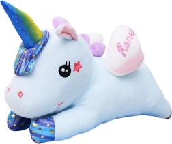 Roztomilý plyšový jednorožec 3v1 je zároveň mazlíček, polštářek a teplá deka v jednom. Díky velikosti 55 cm skvěle poslouží k tulení, zatímco měkká deka 160 × 110 cm ukrytá v bříšku se postará o pohodlí při spánku, odpočinku i na cestách. Jemný, na dotek příjemný plyš je šetrný k dětské pokožce a modré provedení s duhovými akcenty dodá dětskému pokoji kouzelnou atmosféru.