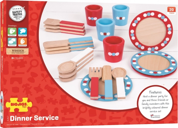 Tato barevná dřevěná jídelní sada je navržena pro začínající mladé kuchaře, kteří chtějí nachystat vlastní večeře a uspořádat čajové dýchánky. Skvělý doplněk každé dřevěné kuchyňky na hraní, sada obsahuje:
