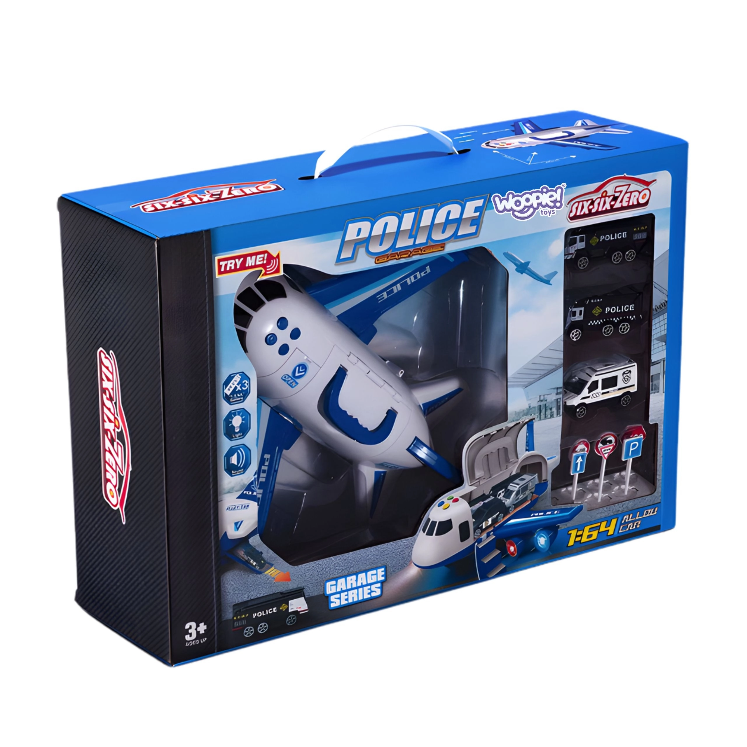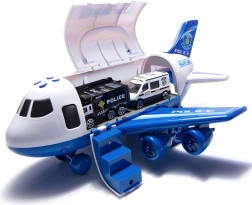 Objevte velký policejní letoun–transporter WOOPIE, který odveze dětskou fantazii na akční misi! Do prostorného trupu se vejdou 3 policejní autíčka a sada značek, nechybí světelné a zvukové efekty se sirénami, otevírací trup a sklopná rampa ani praktické madlo pro snadné přenášení.