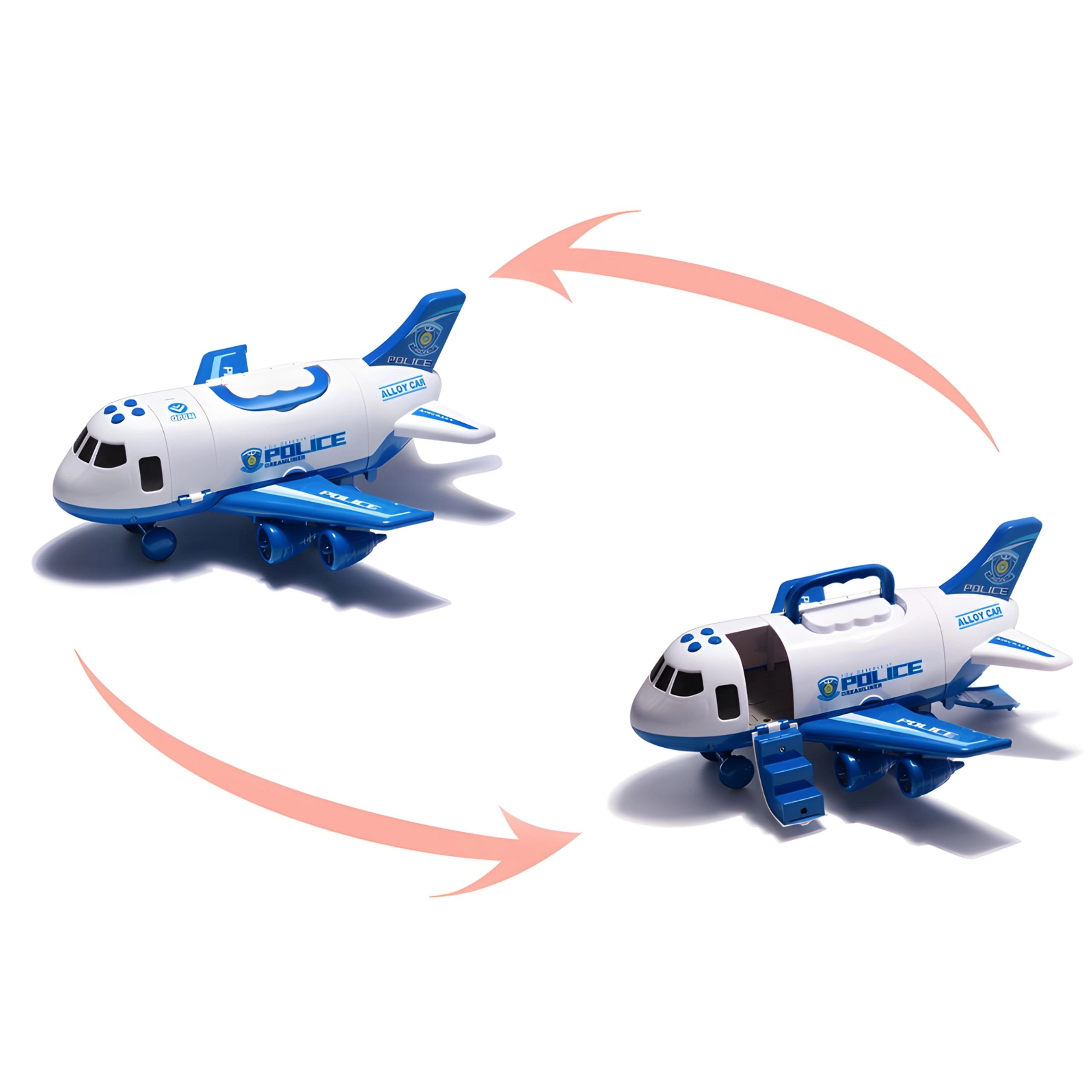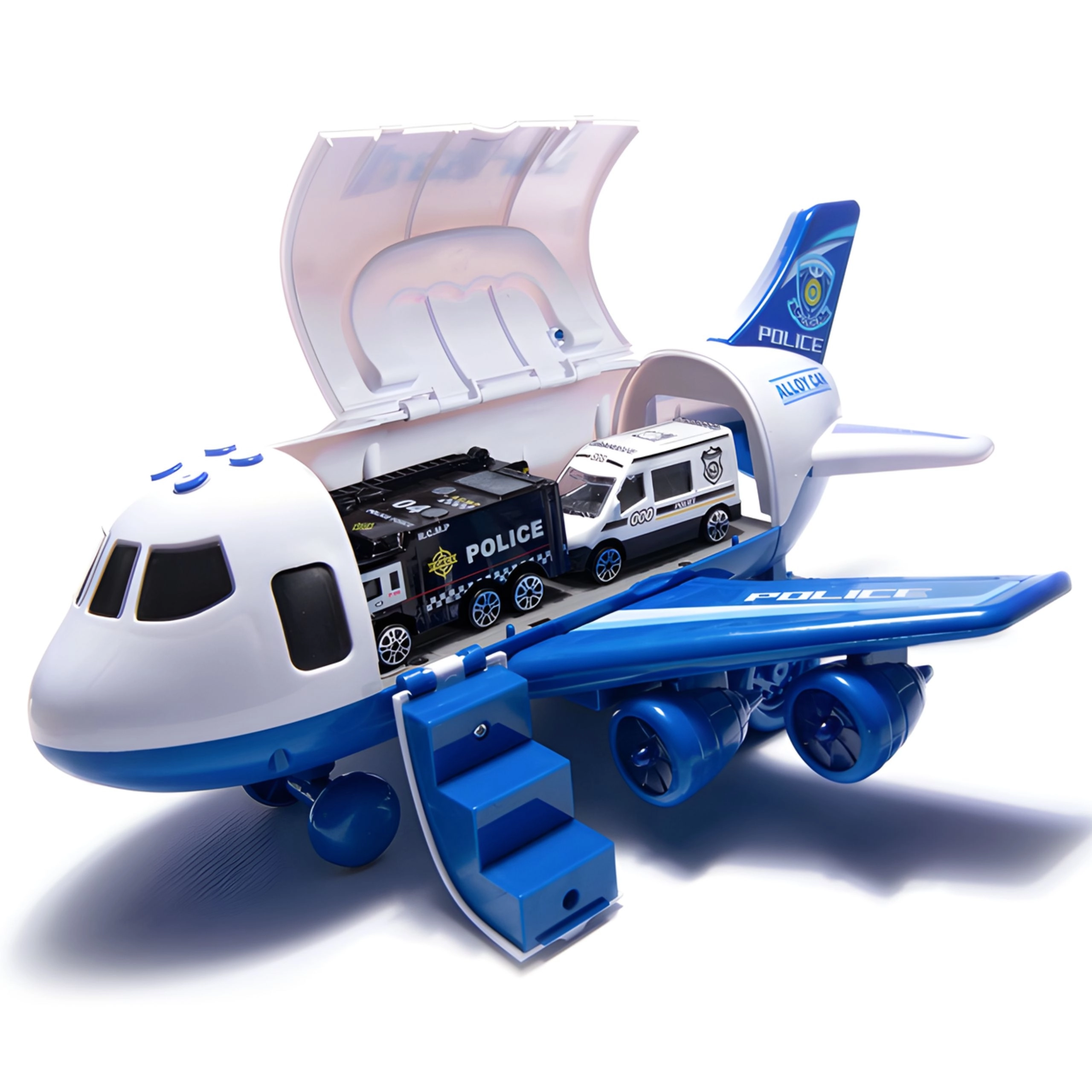 Policejní letadlo–transporter WOOPIE je ideální hračka pro malé strážce zákona od 3 let. Nabízí dynamickou hru s ukládáním aut do trupu, migající LED a reálné sirény na čtyřech tlačítkách. Díky sklopné rampě děti snadno naloží vozidla a vyrazí na záchrannou akci.