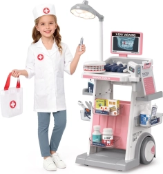 Objevte kreativní hraní na zubaře s tímto mobilním vozíkem pro malé lékaře. Nabízí 26 dílů příslušenství, svítící lampu, model čelistí a RTG obrazovku pro realistickou a zároveň bezpečnou hru, která rozvíjí jemnou motoriku, představivost i zdravé návyky péče o zuby.
