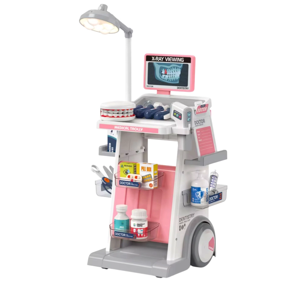 Pojízdný vozík s policemi, držáky a obrazovkou RTG udržuje nástroje přehledně uspořádané a podporuje plynulou hru na lékaře i zubaře.