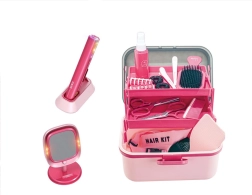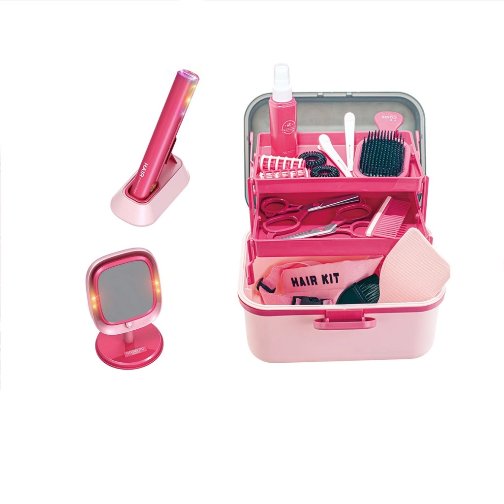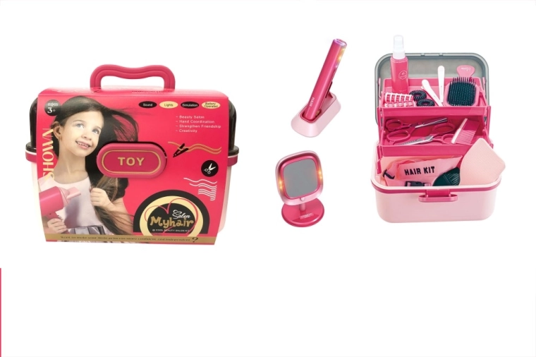 - Dětská vlasová žehlička, nabíjecí stojánek, stolní zrcadlo se světelnými efekty, kufřík s přihrádkami, hřebeny, kartáče, nůžky, sponky, sprej (hračka)