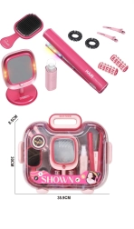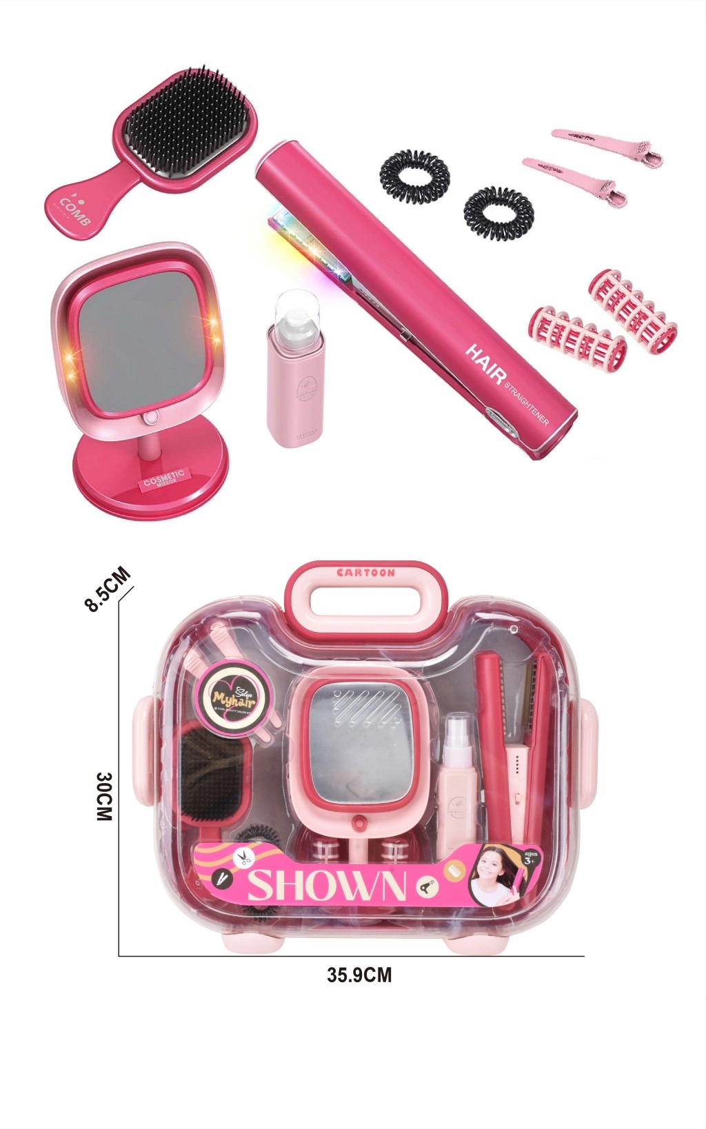 - Obsah sady: dětská žehlička na vlasy (světlo a zvuk), LED stolní zrcadlo s podstavcem, kartáč na vlasy, 2× sponka (různé typy), 2× natáčka, 2× gumička, přenosný kufřík