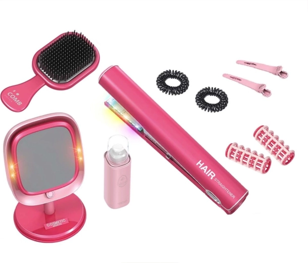 Kompletní sada pro malé kadeřnice přináší dětskou vlasovou žehličku se světlem a zvukem, LED stolní zrcadlo a praktické doplňky v růžové barvě. Vše je uloženo v přenosném kufříku pro snadné ukládání i cestování. Skvělé pro rozvoj jemné motoriky, kreativity a hry na salon krásy.