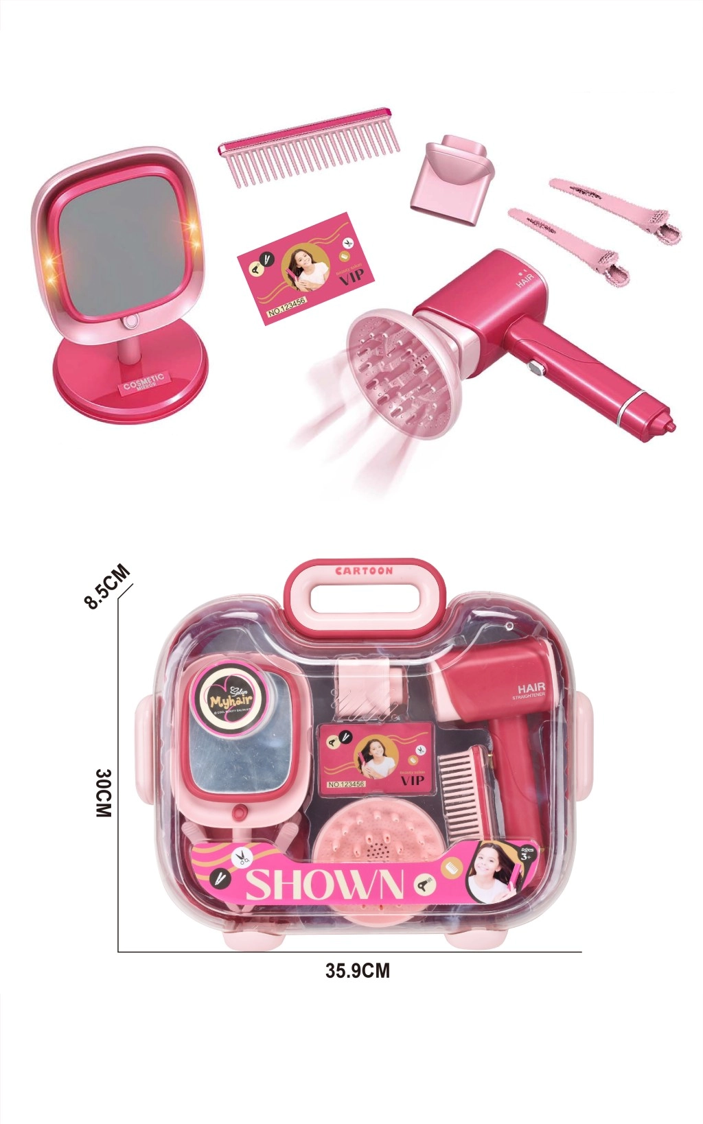 Kompletní sada pro malé kadeřnice nabídne vše pro kreativní hru – růžový fén se světelnými a zvukovými efekty, stojací zrcadlo s osvětlením a praktický kufřík na přenášení. Děti si vyzkouší roli kadeřnice, rozvíjí fantazii, jemnou motoriku i společenskou hru.