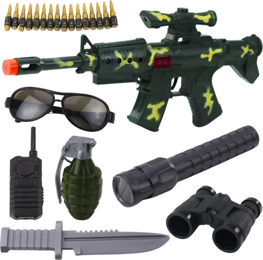 Sada zahrnuje granát, nůž, lornetu, baterku, vysílačku, brýle a pás s náboji – vše pro realistické scénáře a rozvoj představivosti.