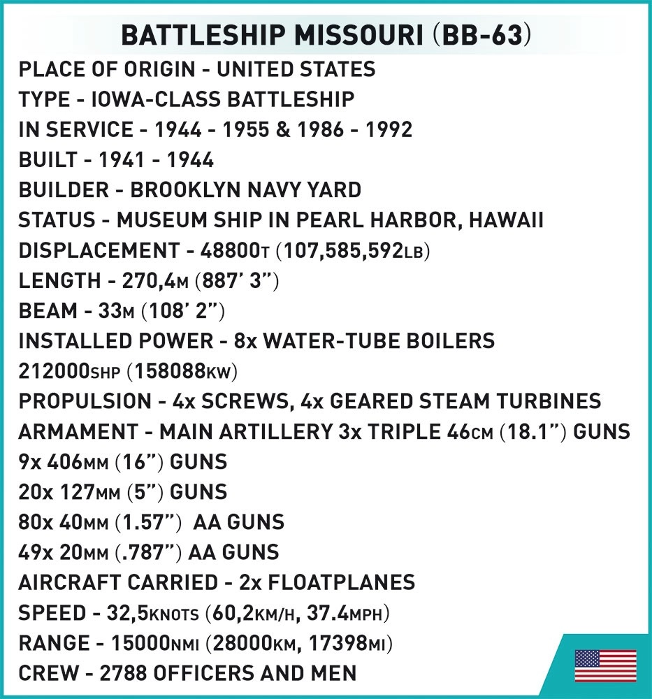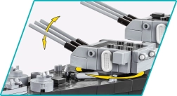 Ikonická bitevní loď USS Missouri, přezdívaná „Mighty Mo“, je poslední postavenou bitevní lodí USA a místem podpisu kapitulace Japonska v roce 1945. Model od COBI v měřítku 1:300 vyniká výjimečnou mírou detailů, realistickým tvarem trupu a superstruktur a spoustou funkčních prvků, které potěší sběratele i nadšené stavitele.
