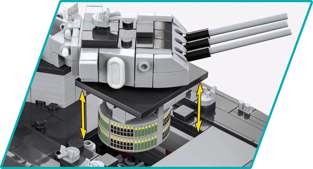 Otočné věže, nastavitelné hlavně, pohyblivý kormidelní a šroubový systém a detaily paluby oživují model a zvyšují zážitek ze stavění i vystavení.