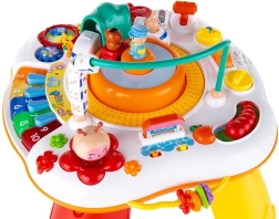 Otočná ozubená kolečka, volant s autíčkem, posuvný červík s mluvenými větami a pestrobarevné kroužky rozvíjejí jemnou motoriku a zvídavost.
