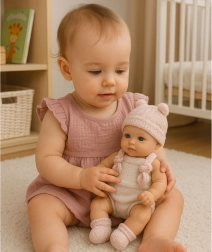 Tato roztomilá panenka miminko v béžovém body s růžovými akcenty vypadá jako skutečné miminko díky jemně modelovaným rysům obličeje a proporcím. Měkký, příjemný materiál a kompaktní velikost 18 cm skvěle padne do dětských ručiček.