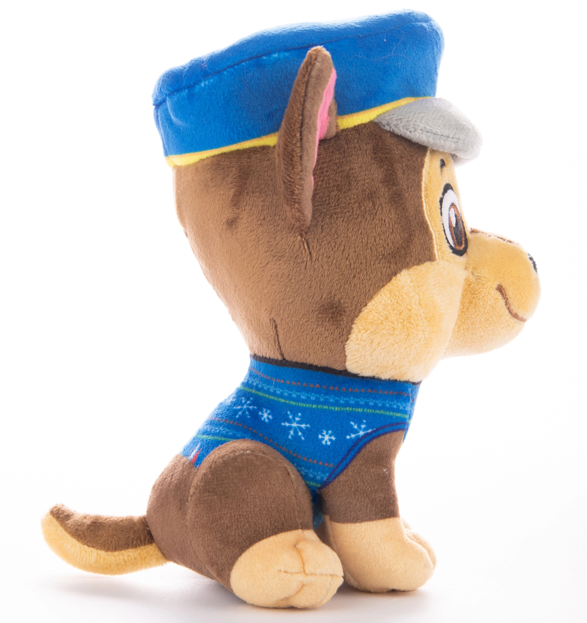 Chase má stylový modrý svetřík se sněhovými vzory, který podtrhuje sváteční atmosféru a dělá z plyšáka krásnou zimní dekoraci.