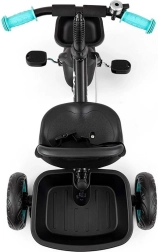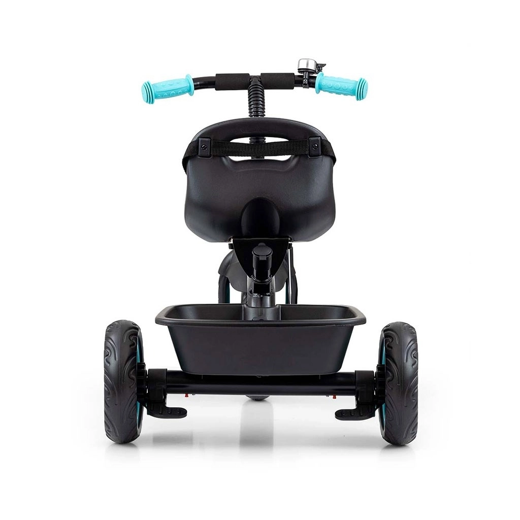 Pro větší pohodlí lze blokovat nebo uvolnit pedály na předním kole: dítě může šlapat, nebo jej můžete vést pomocí vodicí tyče. Tříbodové bezpečnostní pásy se chrániči drží malého jezdce bezpečně v sedle, zatímco přední košík a zadní vanička pojmou oblíbené hračky. Zvoněk na řídítkách zvyšuje bezpečnost i zábavu.