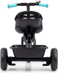 Tříbodové pásy se chrániči drží dítě pevně v sedle, zatímco přední košík a zadní vanička nabízejí místo pro hračky a drobnosti.