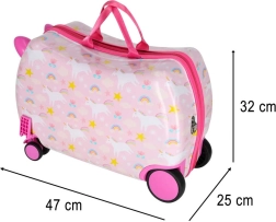 Konstrukce kufru umožňuje dítěti pohodlně sedět a nechat se táhnout pomocí popruhu. Stabilní boky a opěrky nohou zvyšují komfort i bezpečí.