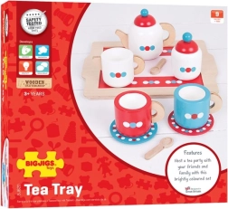 Vše, co děti potřebují k hostitelství: konvice, šálky s podšálky, cukřenka, konvička na mléko, lžičky a stabilní podnos pro snadné servírování.