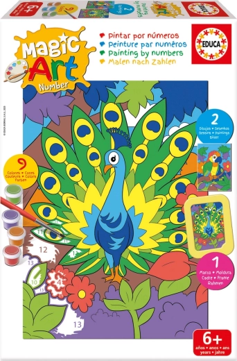 Sada Educa malování podle čísel – páv a papoušek vám umožní krok za krokem vybarvovat očíslované části podle přiložené předlohy. Každé číslo na plátně odpovídá jedné konkrétní barvě, takže výsledek je vždy efektní a sebevědomě zvládnutý.