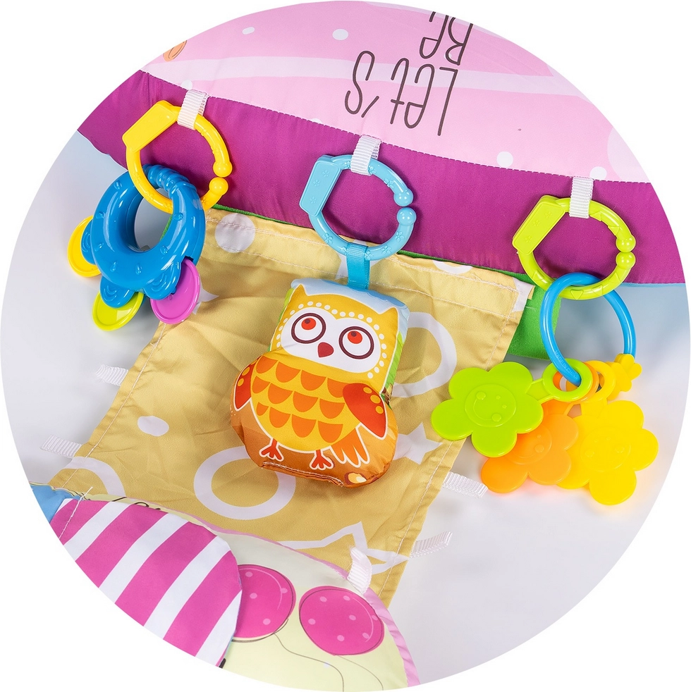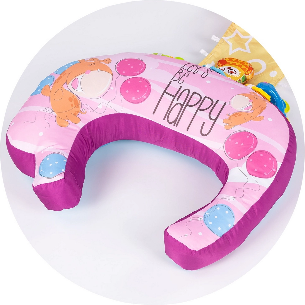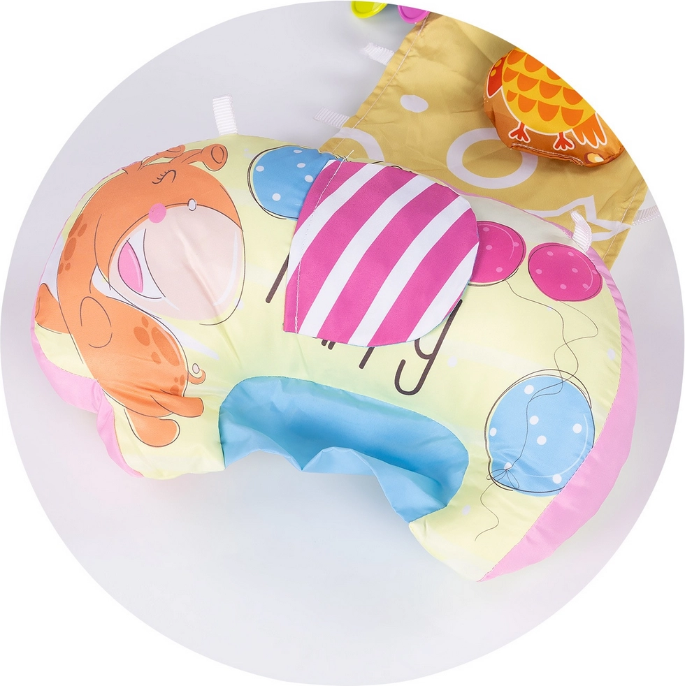 Polštář je praktický, snadno udržovatelný a skvěle se hodí pro tummy time (pasení koníčků), jemné cvičení i první pokusy o samostatné sezení. Barevné motivy a závěsné hračky (u vybraných variant) podporují smyslovou stimulaci a rozvoj jemné motoriky.