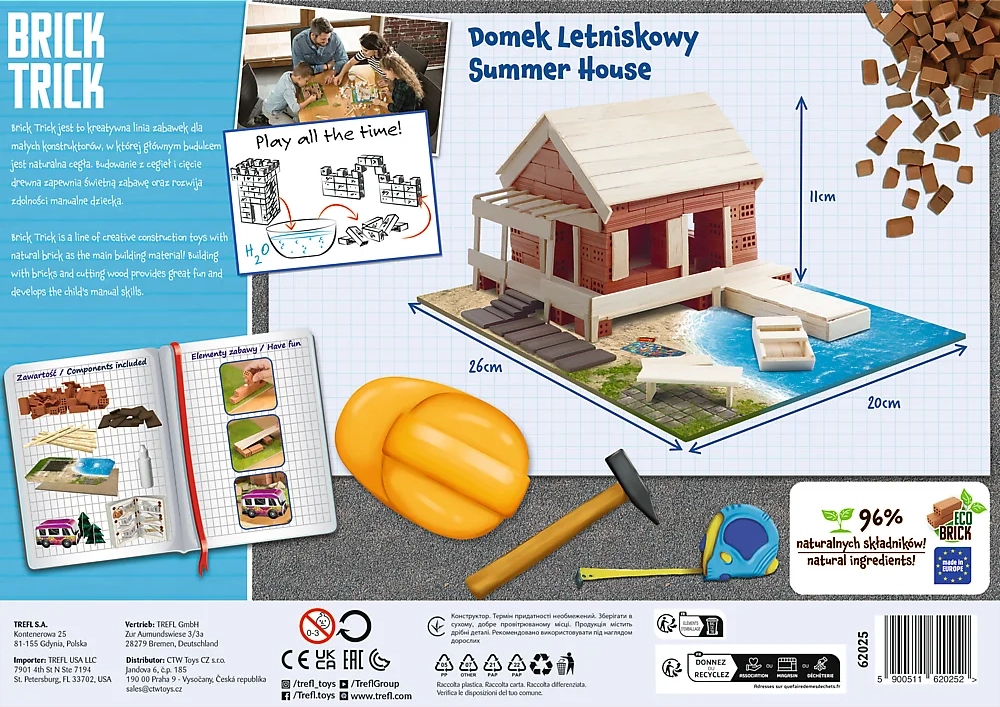 Stavebnici lze díky vodou rozpustnému lepidlu používat opakovaně – model snadno rozeberete, cihličky očistíte a můžete stavět nový projekt. Kombinací více sad TREFL Brick Trick vytvoříte malebnou vesničku, moderní město či středověkou osadu.