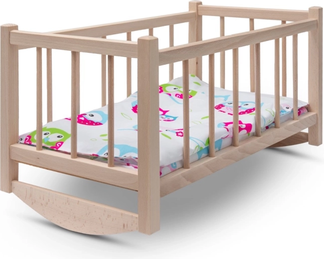 Kolébka je vyrobena z přírodního dřeva s hladkým povrchem, bez ostrých hran. Stabilní konstrukce odolá každodenním hrám a podpoří rozvoj fantazie a pečujících dovedností dětí.