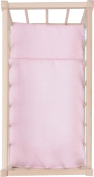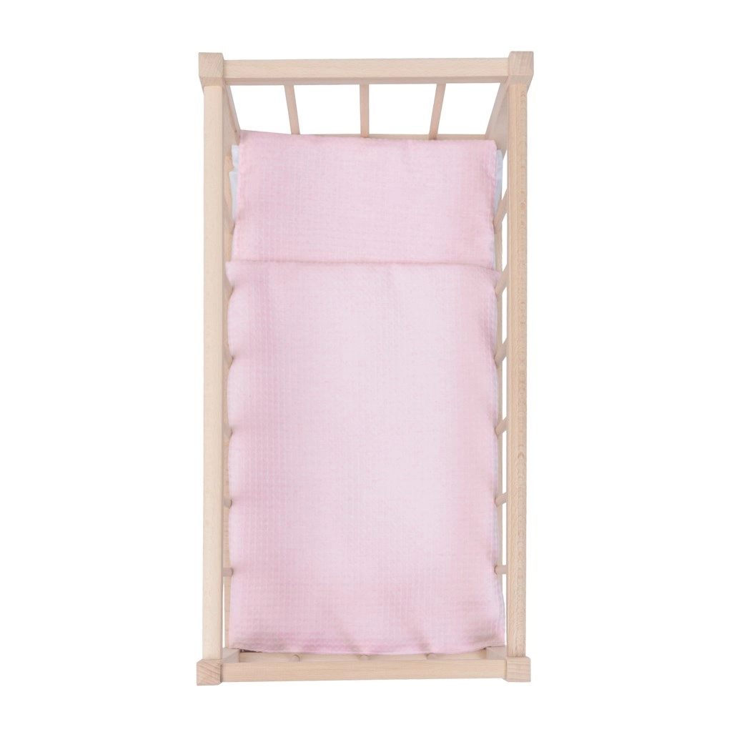 Součástí je matrace, polštář a peřinka v jemné růžové barvě – měkké, příjemné na dotek a sladěné do harmonického setu.