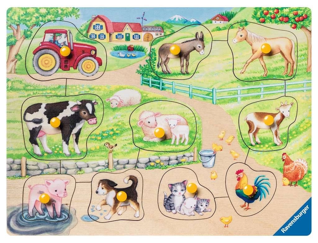 Dřevěná vkládačka Ravensburger z řady Moje první dřevěné puzzle přináší dětem radost z učení hrou. Deset pevných dílků s láskyplně ilustrovanými motivy z farmy pomáhá rozvíjet klíčové dovednosti a podporuje správný úchop díky plastovým úchytkám na každém dílku.