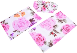 Součástí je měkký polštářek a deka s barevným květinovým vzorem – vše sladěné a připravené pro panenky i plyšáky.
