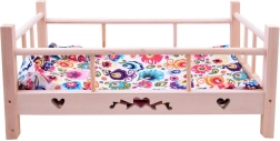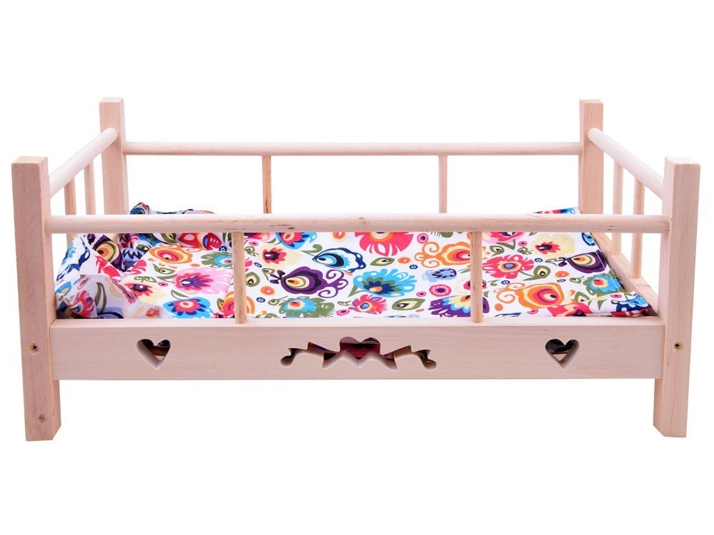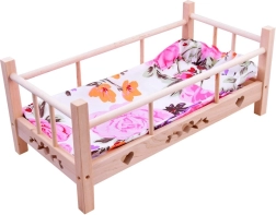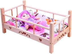 Roztomilá dřevěná postýlka pro panenky do výšky 50 cm s měkoučkým polštářkem a dečkou. Vyrobena z přírodního neošetřeného dřeva, má pevné bočnice a stabilní konstrukci pro dlouhou a bezpečnou hru. Součástí je textilní lůžko. Přírodní dřevo, kvalitní zpracování a kompletní ložní set potěší každou malou pečovatelku.