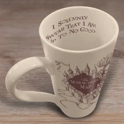 Objevte tajemství Bradavic s elegantním hrnkem inspirovaným legendárním Pobertovým plánkem. Vysoké keramické tělo s jemným béžovým základem a detailní tmavohnědou grafikou zaručí, že si svůj oblíbený nápoj vychutnáte ve velkém stylu. Uvnitř lemu najdete ikonickou hlášku „I solemnly swear that I am up to no good“, která potěší každého fanouška.
