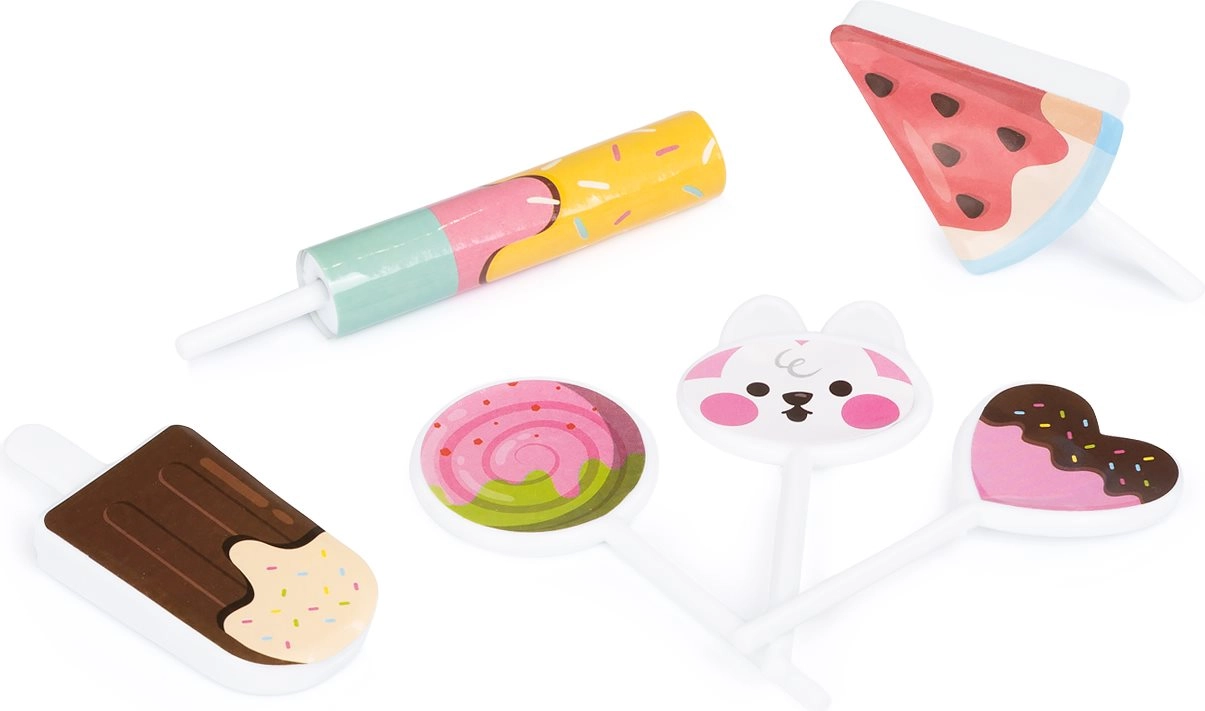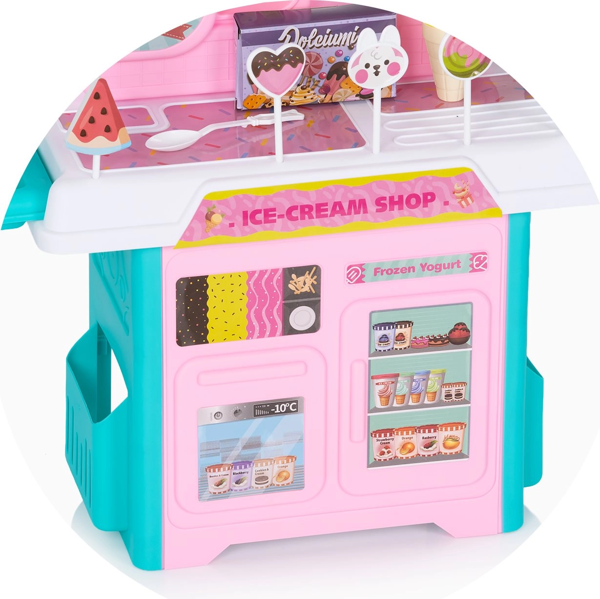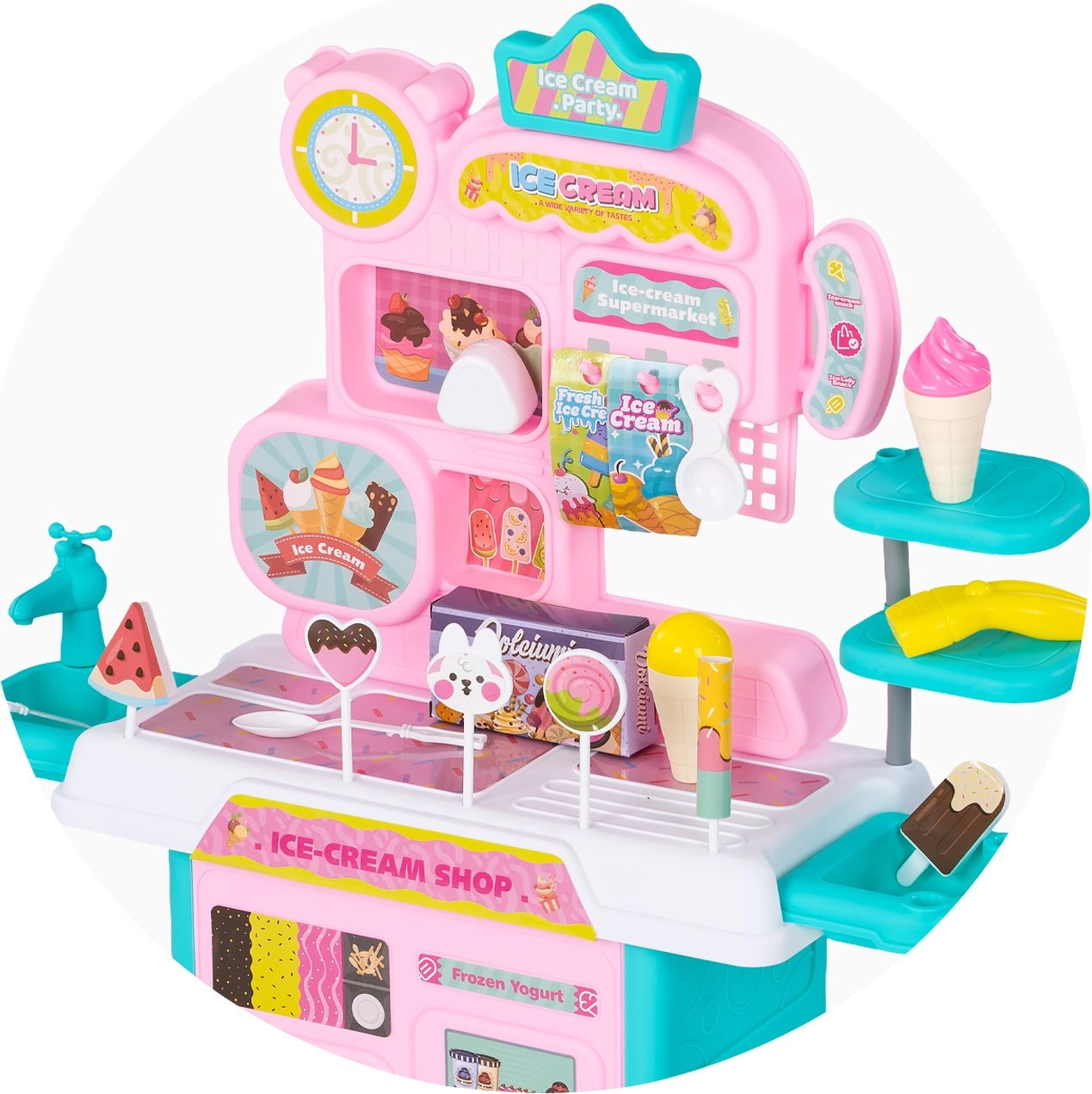 Proměňte dětský pokoj v malý zmrzlinový stánek! Sada nabízí kornouty, naběračky, kopečky a lízátka, aby si děti mohly „připravovat“ a servírovat různé druhy zmrzlin, vymýšlet vlastní kombinace chutí a hrát si na prodej.