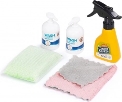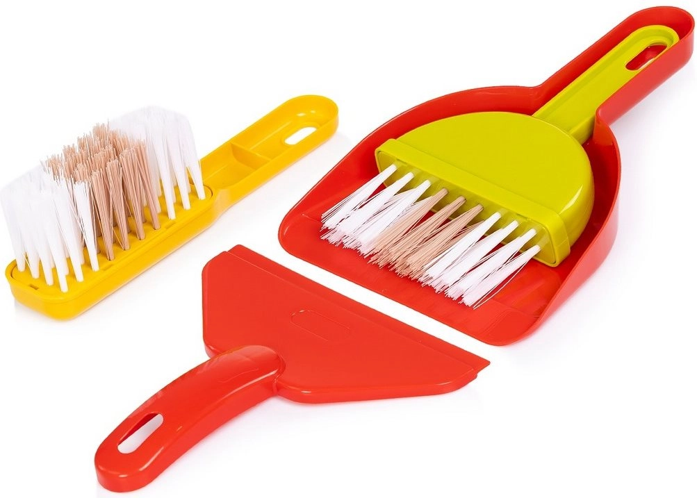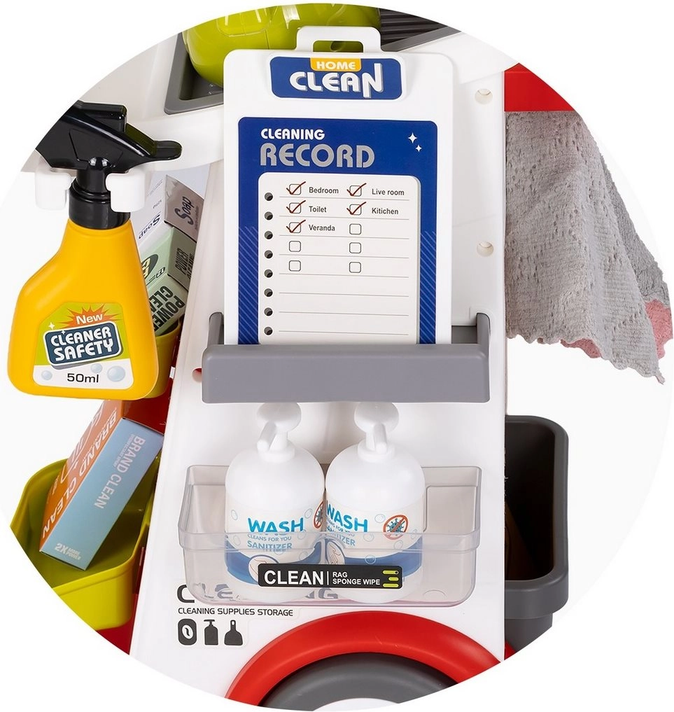 Součástí je široká sada doplňků: vysavač, mop, koště, smetáček a lopatka, sprejová lahvička, houbička a hadříky, případně také výstražná značka a koš. Vše je uzpůsobeno dětským rukám pro bezpečné držení a snadné ukládání na vozík. Kvalitní materiály zaručují dlouhou životnost i při častém používání.