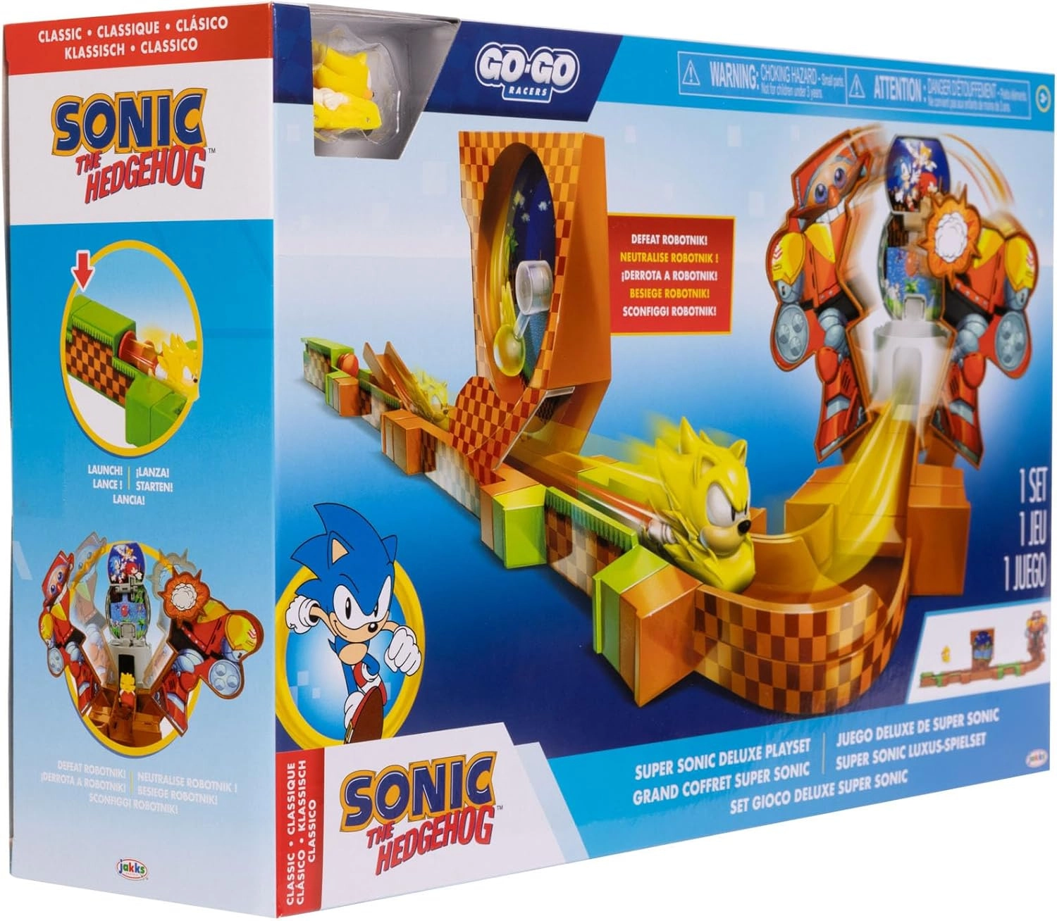 Závodní dráha inspirovaná hrami SONIC THE HEDGEHOG od značky Jakks Pacific přenáší dynamiku videoher do dětského pokoje. Trať nabízí ikonickou smyčku, rampy a cílovou překážku s Dr. Eggmanem, kterou musí SONIC porazit.