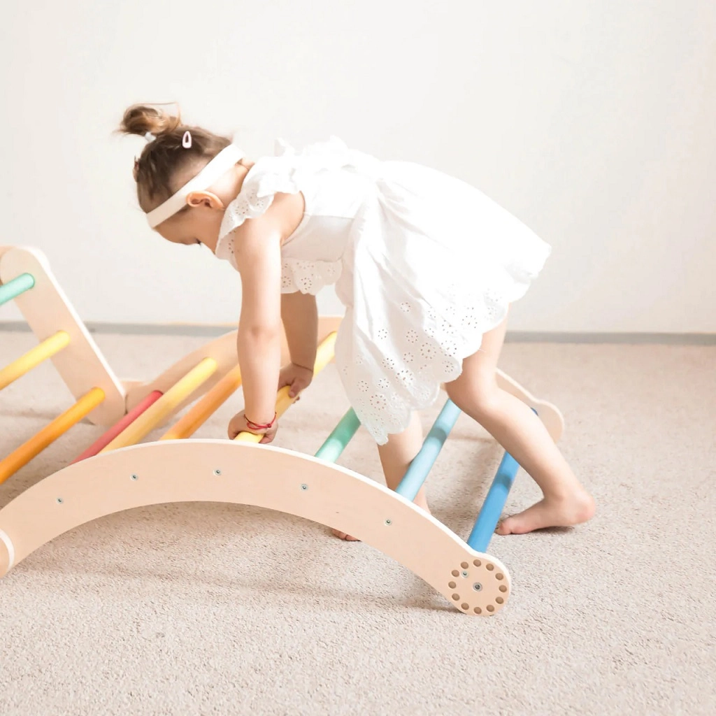 Sestava se skládá ze dvou lezeckých trojúhelníků (větší a menší) a balančního oblouku, které lze jednoduše propojit do různých tvarů – most, tunel, žebřík či domeček. Přirozená struktura březové překližky v kombinaci s jemnými duhovými odstíny dodává hračce moderní vzhled a motivuje děti k aktivnímu pohybu.