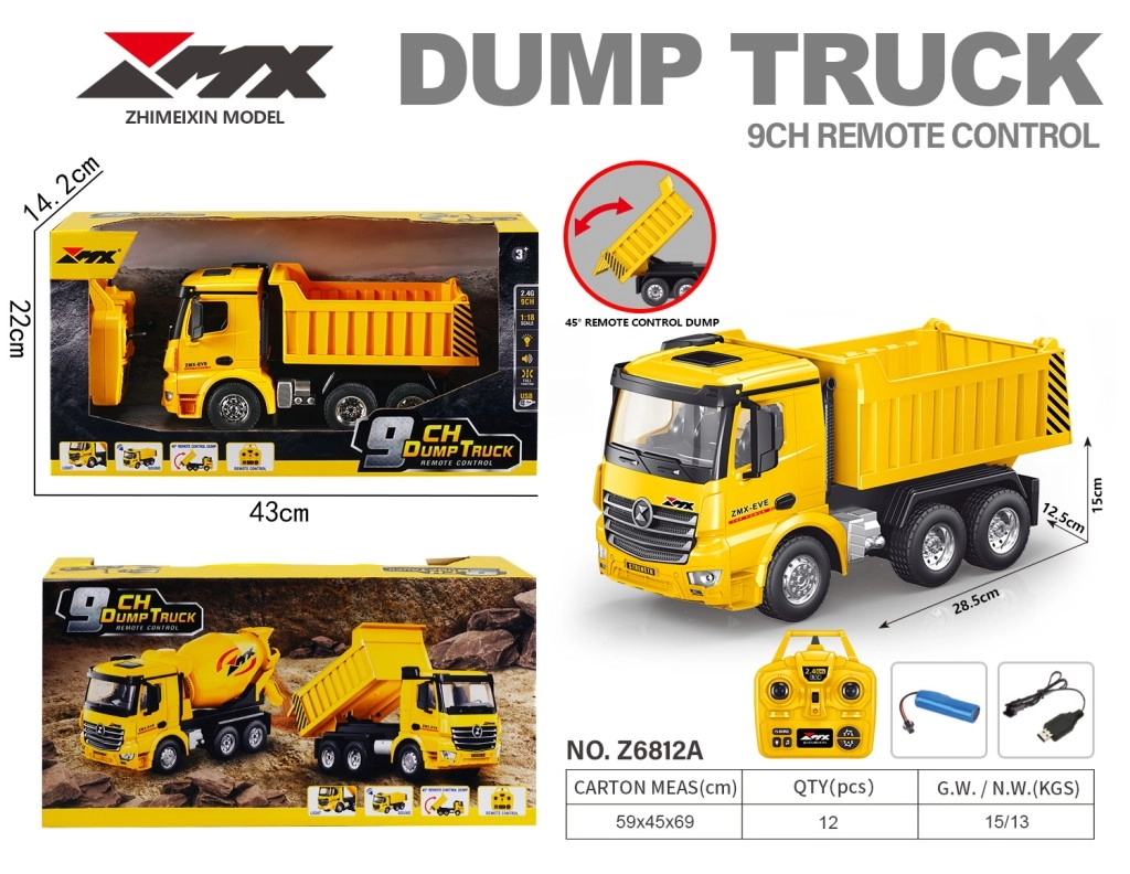 Dálkové ovládání na frekvenci 2.4 GHz zaručuje stabilní přenos signálu s dosahem až 30 m a 9 kanálů pro plnou kontrolu – jízda vpřed/vzad, zatáčení i aktivace sklápění. Integrované světelné a zvukové efekty umocňují zážitek a dělají model atraktivním pro začátečníky i zkušené fanoušky RC.