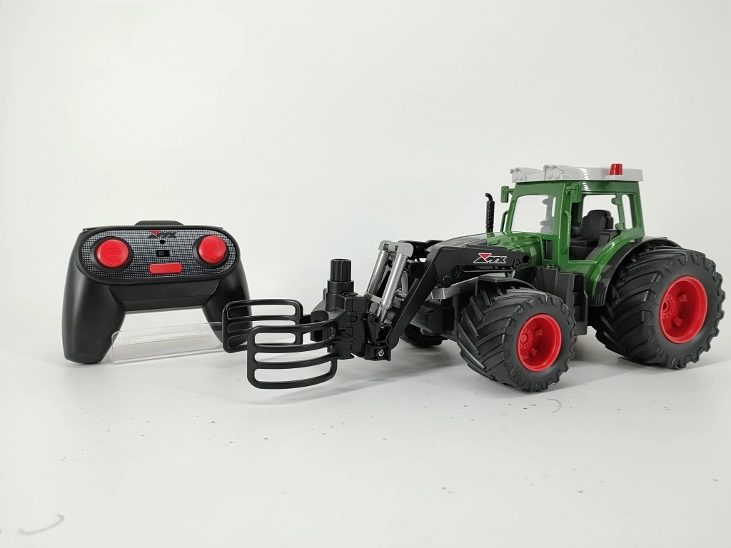 Přední nakládací rameno s kleštěmi umožňuje snadné uchopení a manipulaci s balíky, takže děti mohou napodobovat skutečné farmářské práce. Ovládání probíhá přes ergonomický 2.4 GHz ovladač se šesti kanály pro plynulou jízdu a zatáčení, s dosahem až 30 metrů. Dobíjecí Li-ion baterie 3,7 V se nabíjí přes USB, což je pohodlné a úsporné.
