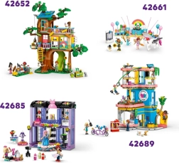 LEGO Friends zábavné interiérové hřiště je navrženo pro hravé děti, které chtějí objevovat, tvořit a budovat vlastní příběhy. Tři propojené části s atrakcemi přinášejí rozmanité výzvy – od oranžové lezecké sítě přes modrou skluzavku do bazénu s barevnými míčky až po trampolínu, kolotoč a roztomilého skákacího králíčka. Nechybí ani realistické doplňky jako bufet s hot dogy a ledovou tříští, taneční automat, automat na žvýkačky a pokladna.