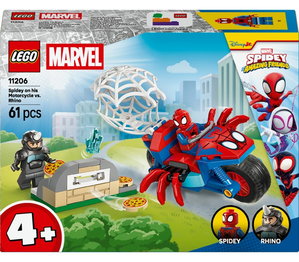 Tato barevná stavebnice přináší akční honičky i humorné momenty – Spidey na červeně-modré motorce s pavoučími detaily pronásleduje Rhina, který střílí létající plátky pizzy z vlastní pece. Děti si užijí snadné stavění, spoustu doplňků a možnost chytit Rhina do pavučiny.