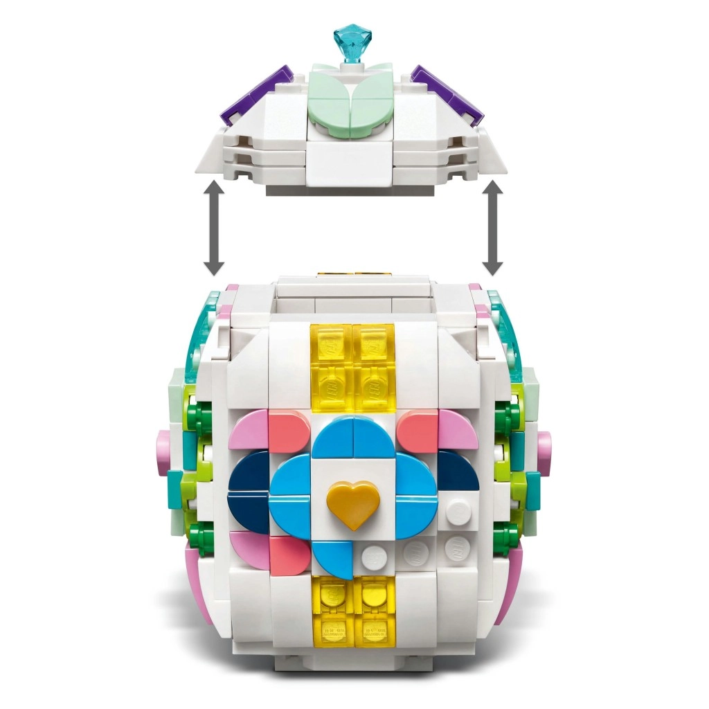 Toto elegantní bílé vajíčko z kostek LEGO je vysoké přibližně 10 cm a široké 7,9 cm – ideální velikost na poličku, stůl či velikonoční aranžmá. Díky bohaté sadě pastelových a transparentních dílků (srdíčka, lístky, „diamanty“) si snadno vytvoříte originální vzor a kdykoli jej obměníte.