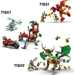 Součástí je pružinový vystřelovač na dvě šipky, které lze odpojit a přemístit na boční část se „zelení“ pro taktičtější hraní. V kokpitu se pohodlně usadí dvě minifigurky. V balení najdete celkem pět postav – Jaye, Nyu, Kaie v dračí podobě, zemské monstrum a vůdkyni loajalistů – pro pestré příběhy z vesmíru NINJAGO.