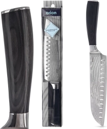 Precizní kuchyňský nůž santoku s celkovou délkou 31 cm a ostřím 18 cm z 67vrstvé damaškové oceli pro výjimečnou ostrost a trvanlivost. Ergonomická rukojeť z dřeva pakka skvěle padne do ruky, grantonové výbrusy na čepeli minimalizují přilnavost potravin. Ideální pro krájení, sekání a plátkování ovoce, zeleniny i masa v domácí i profesionální kuchyni.