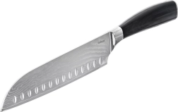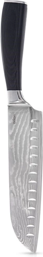 Nůž santoku kombinuje japonskou inspiraci a evropské standardy zpracování. 67vrstvá damašková ocel poskytuje mimořádnou tvrdost, odolnost a dlouhotrvající ostrost, zatímco plochý profil čepele usnadňuje přesné řezy a rychlou přípravu surovin. Díky grantonovým dutinkám se plátky nelepí na čepel a krájení je plynulé.