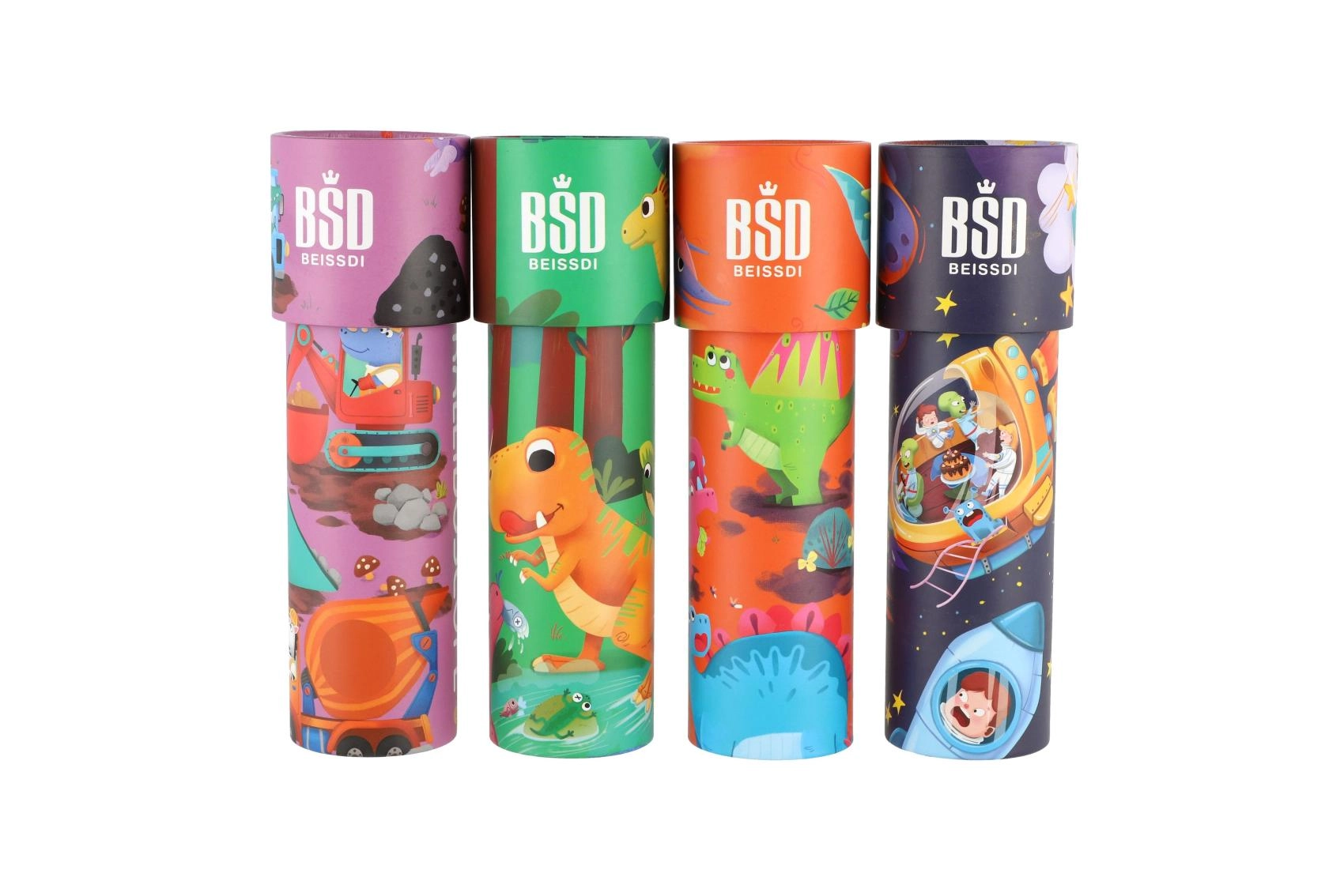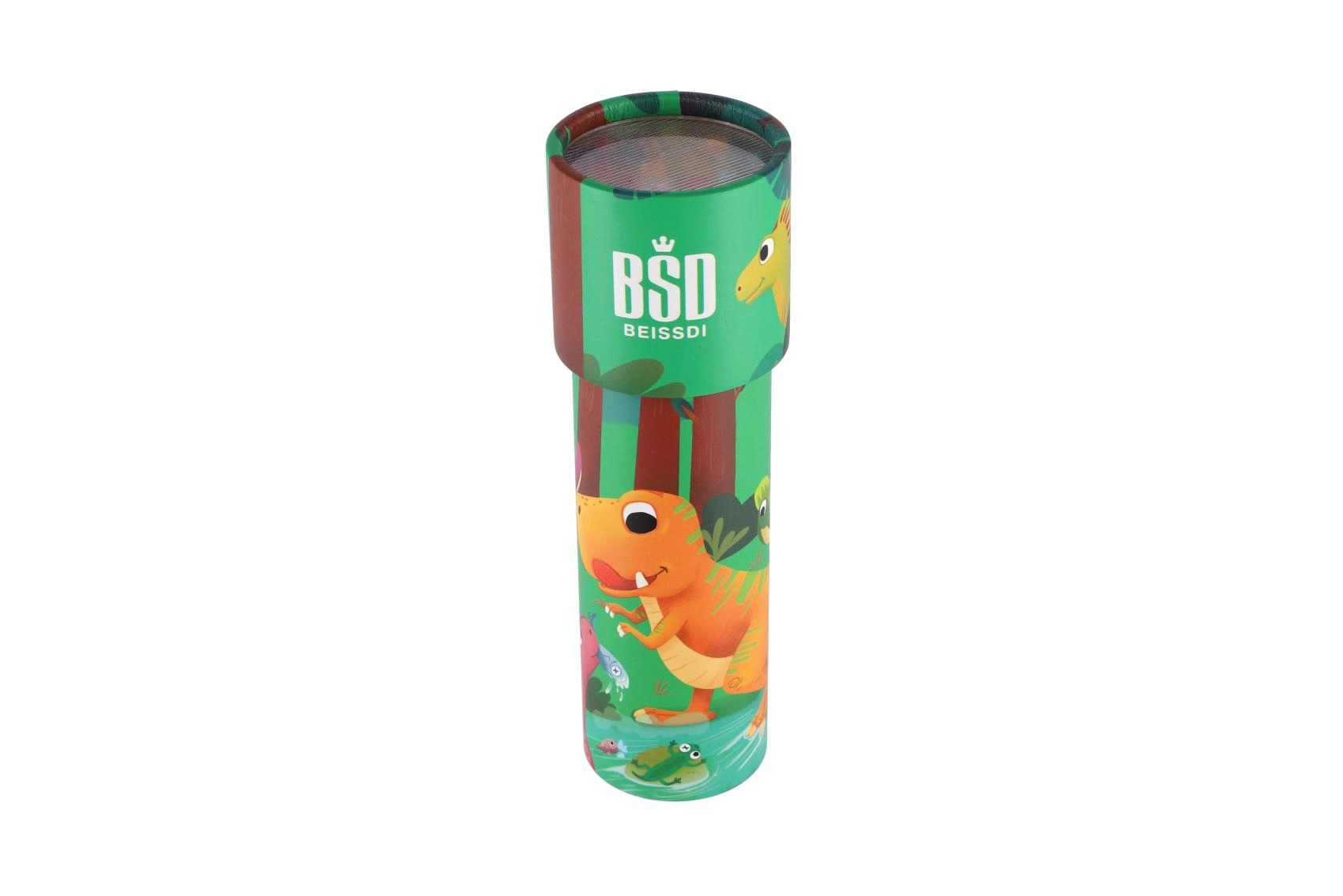 Zábavné ilustrace dinosaurů podporují dětskou fantazii a dělají z kaleidoskopu atraktivní drobný dárek.