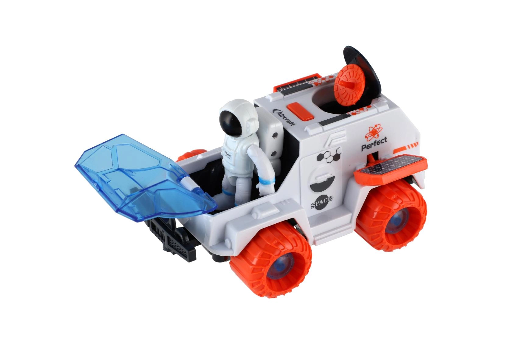 Tento plastový vesmírný rover je ideální hračkou pro malé objevitele. Setrvačníkový pohon umožňuje snadnou jízdu bez baterií a velká oranžová kola si poradí s nerovným povrchem. Součástí je také figurka astronauta, se kterou mohou děti okamžitě začít tvořit vlastní příběhy z galaktických expedic.