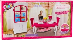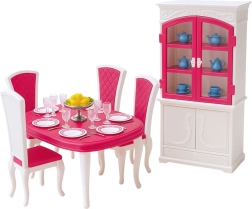 Elegantní set nábytku a doplňků pro panenky cca 29 cm promění každý domeček v realistickou jídelnu. Obsahuje stůl, židle, kredenc s otevíracími dvířky a bohatou stolní výbavu. Odolné plastové provedení, růžovo‑bílá barevnost a klasický styl podporují kreativní hru, rozvoj sociálních dovedností a rolových scén. Splňuje normy CE a EN71.