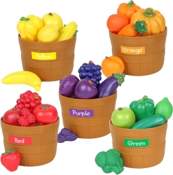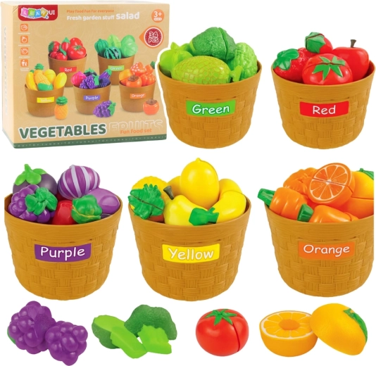Barevná edukativní sada se 34 díly naučí děti třídění barev, kategorie a základní kuchyňské dovednosti. Realistické plody z bezpečného plastu lze krájet na suchý zip, součástí jsou třídicí košíčky, plastový nožík a prkénko. Skvělá volba pro rozvoj jemné motoriky, koordinace ruka–oko a kreativní hry doma i ve školce.