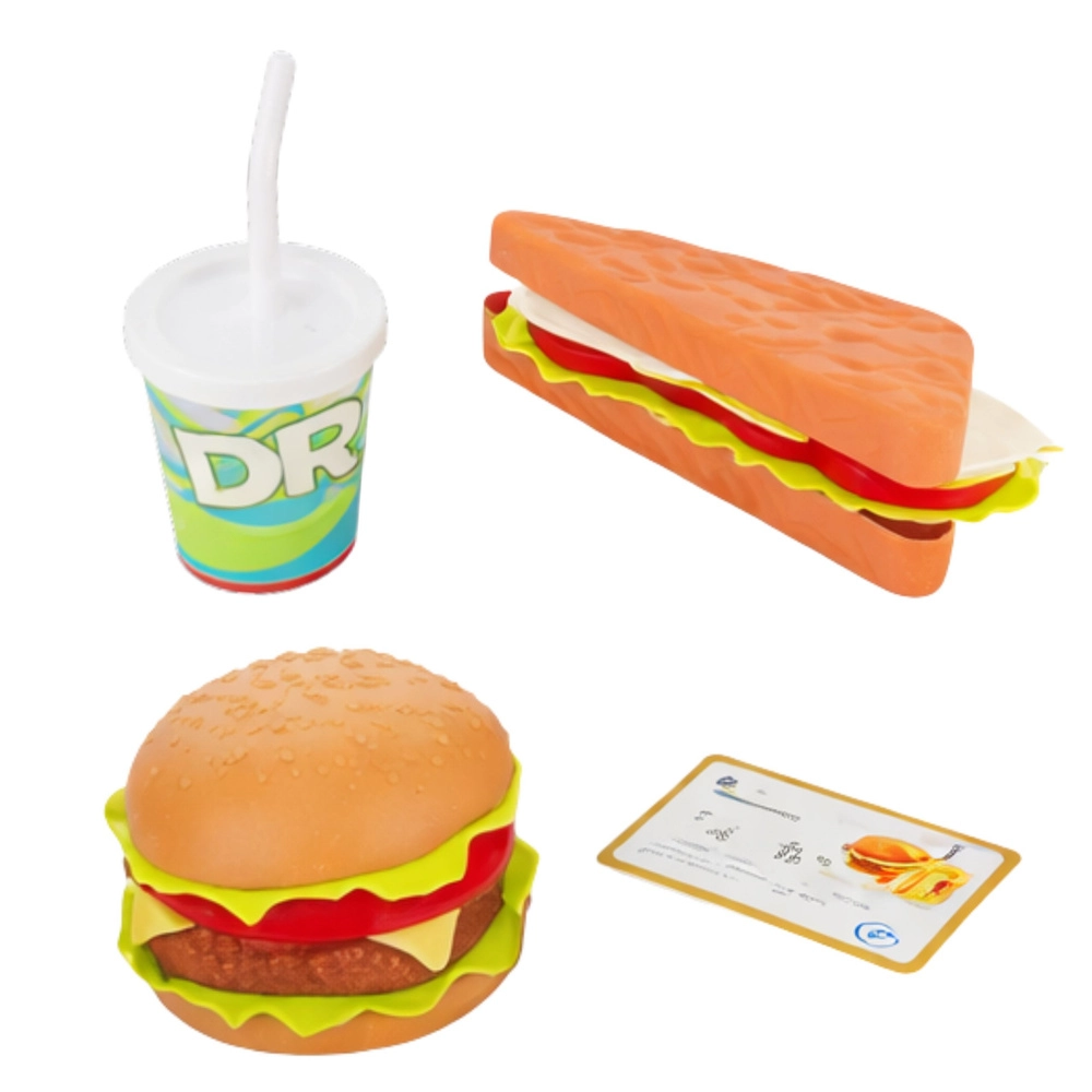 Burger, bageta a nápoj doplní scénář restaurace. Děti mohou objednávat, servírovat i platit – kompletní zážitek z rychlého občerstvení.