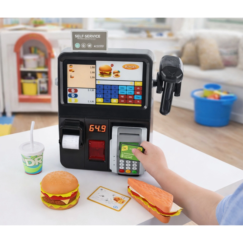 Interaktivní dětská pokladna pro hru na obchod a restauraci přináší realistickou zábavu se světelnými a zvukovými efekty. Děti mohou skenerem „pípnout“ položky, vytisknout účtenku a zaplatit přes platební terminál. Velký barevný displej, bohaté příslušenství s fast food jídlem a odolné provedení podporují fantazii, komunikaci i jemnou motoriku.
