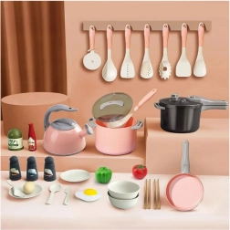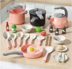 Objevte zábavu při vaření s touto velkou dětskou kuchyňskou sadou o 32 dílech v jemných růžových a šedých tónech. Realistické hrnce, pánev a čajník doplňují nádobí, příbory, kořenky a potraviny pro autentickou hru na kuchaře. Bezpečné a odolné provedení podporuje kreativitu, jemnou motoriku i společenské dovednosti během hraní rolí.