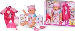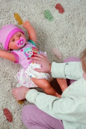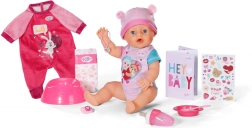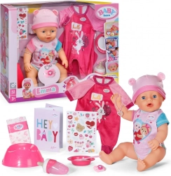 Oblíbená panenka BABY born Emma 43 cm v něžném růžovém body přináší spoustu interaktivní zábavy. Umí pít z lahvičky, plakat, používat nočník a díky magickému talířku se při nalití vody objeví „jídlo“ pro realistické krmení. Oči se jí pomocí kouzelného dudlíku otevírají a zavírají, při uložení ke spánku je sama zavře. Je ohebná, vhodná do vany a snadno se čistí.