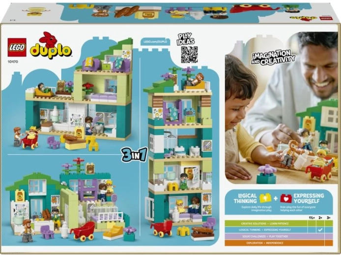 Objevte všestrannou stavebnici LEGO DUPLO moderní rodinný dům 3 v 1 se 166 dílky pro děti od 2 let. Děti si postaví 3 různé modely domu – jednopatrový byt, třípatrový dům nebo pětipatrový domek se střešní zahradou. Součástí jsou 4 figurky rodiny a řada doplňků (kočárek, lednička, toaleta aj.), které podporují kreativní hraní, rozvoj jemné motoriky i sociálních dovedností.